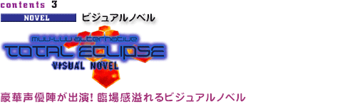 テックジャイアン誌(エンターブレイン刊)にて好評連載中の外伝小説『マブラヴ オルタネイティヴ トータル・イクリプス』の第壱話・第弐話をノベル形式にて収録。豊富な絵素材と豪華声優陣による音声、そして綿密に計算された効果音とBGMによって、臨場感溢れる物語をお楽しみいただけます。